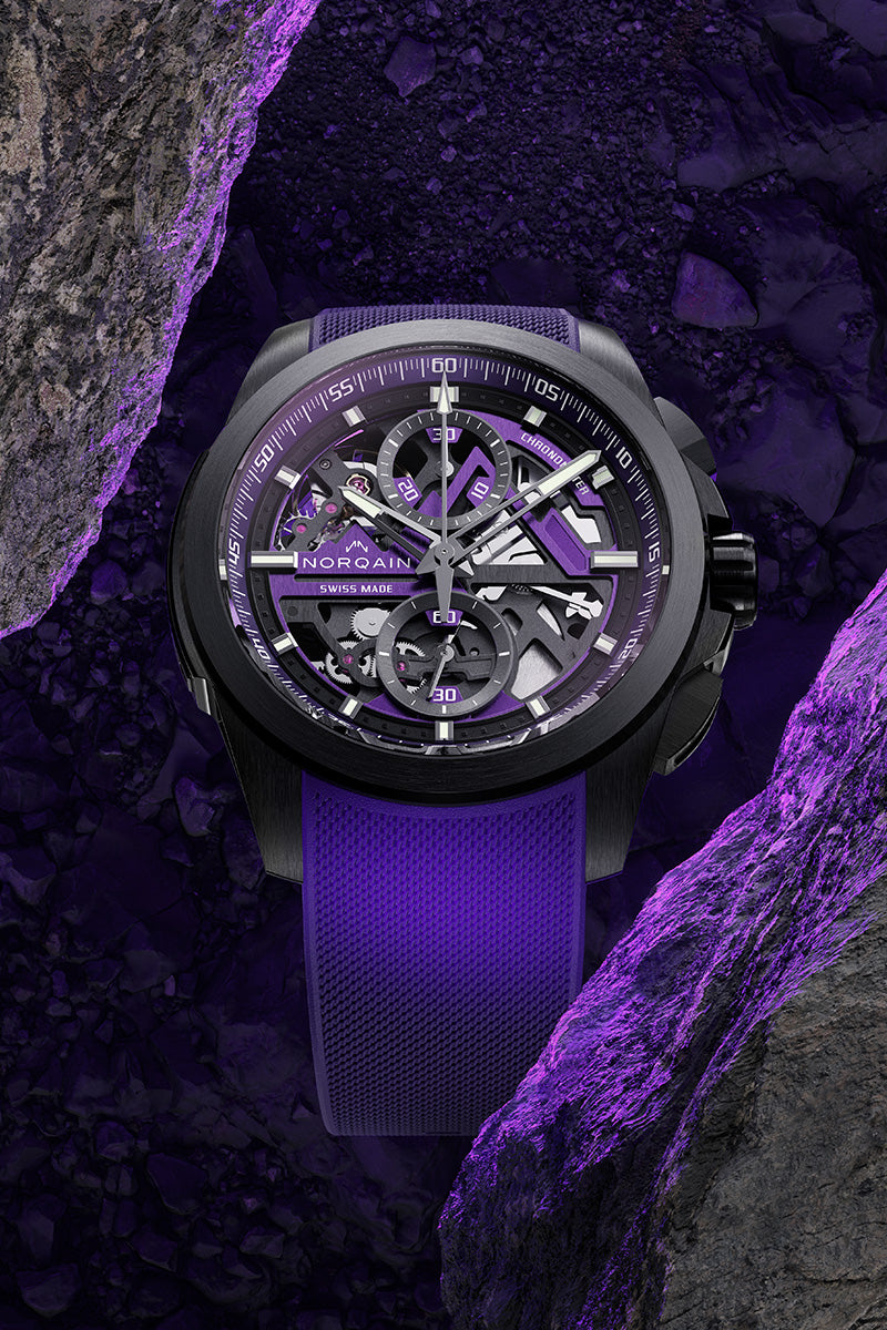 The Independence Skeleton Chrono is powered by the NORQAIN 8K Manufacture Calibre, an exclusive high-performance skeletonised flyback chronograph movement inspired by the world’s highest mountains. This model is the first chronograph in the Independence collection.