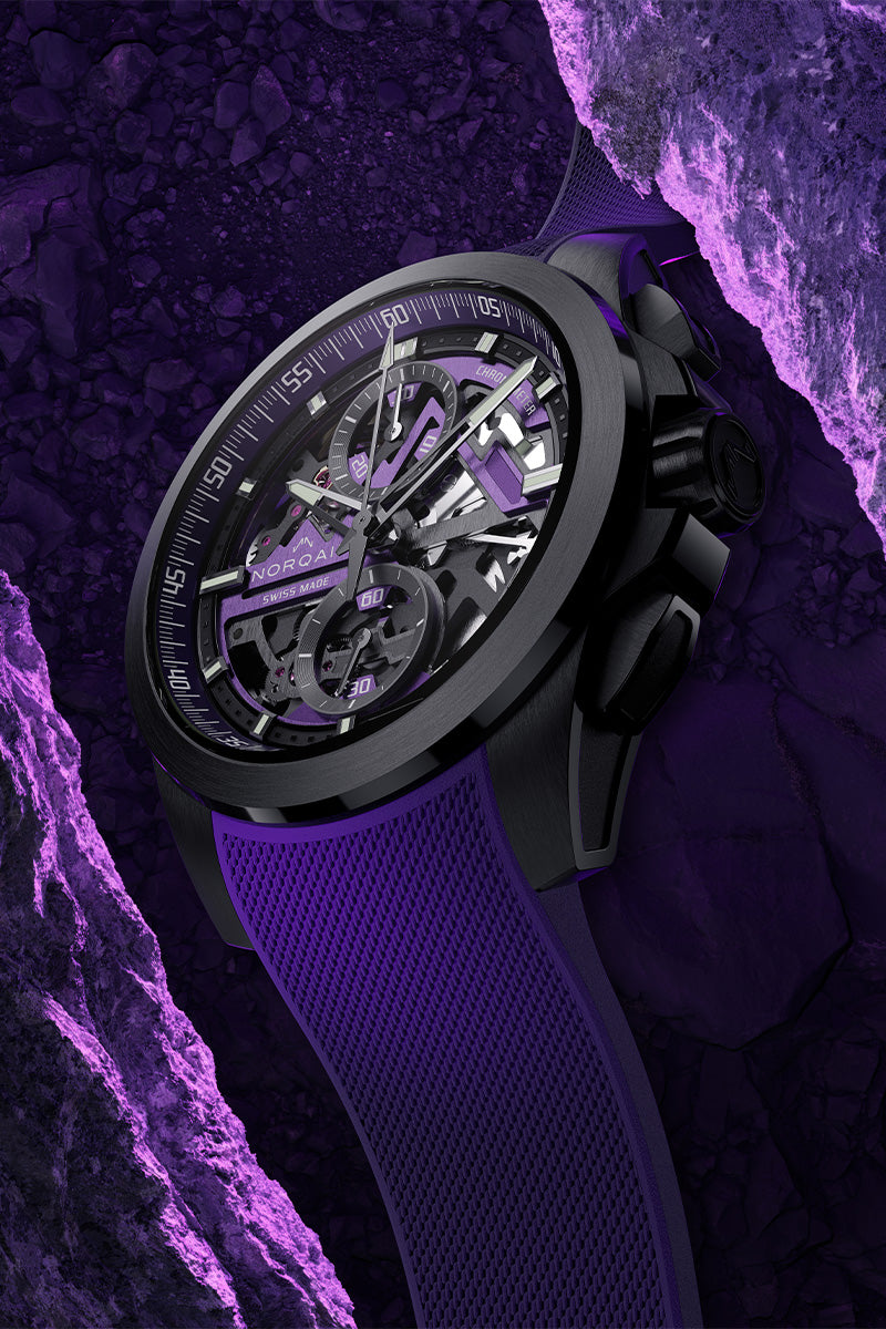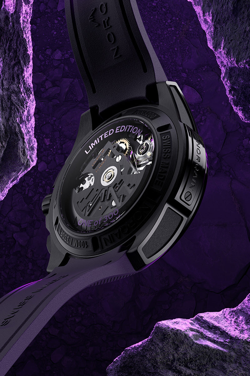 This exclusive timepiece features a lightweight Grade 5 Titanium case, marking the first NORQAIN watch with a case made entirely of Titanium. Limited to only 300 pieces, this innovative watch weighs less than 90 grams.