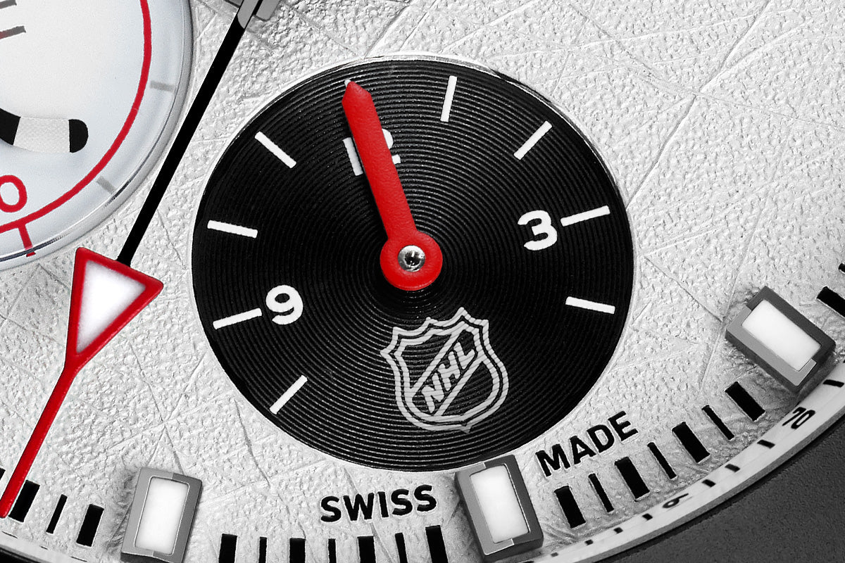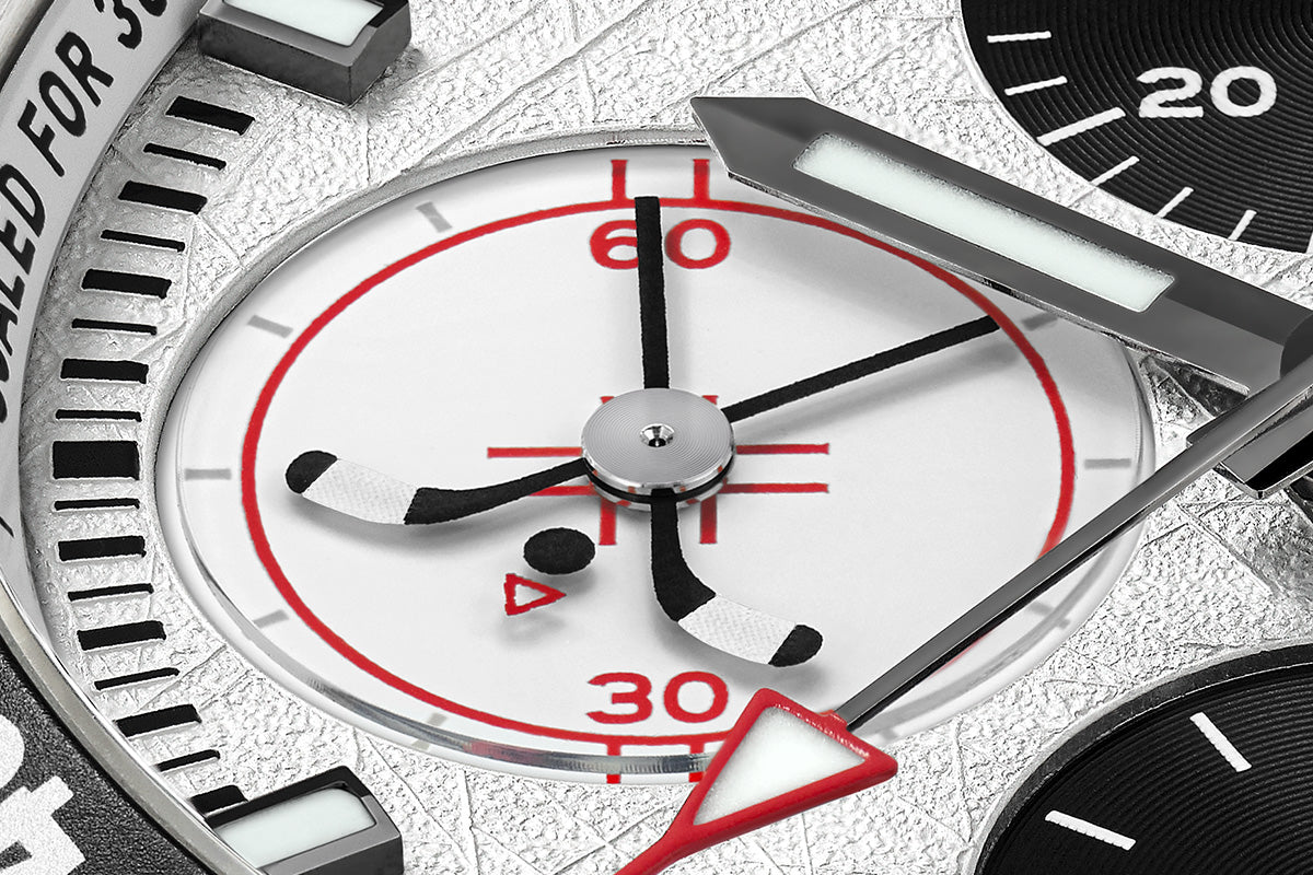 L’orologio si basa sul modello Adventure Chrono in acciaio inossidabile e presenta una serie di dettagli unici che riflettono l’intensità e il carisma dell’hockey professionistico.