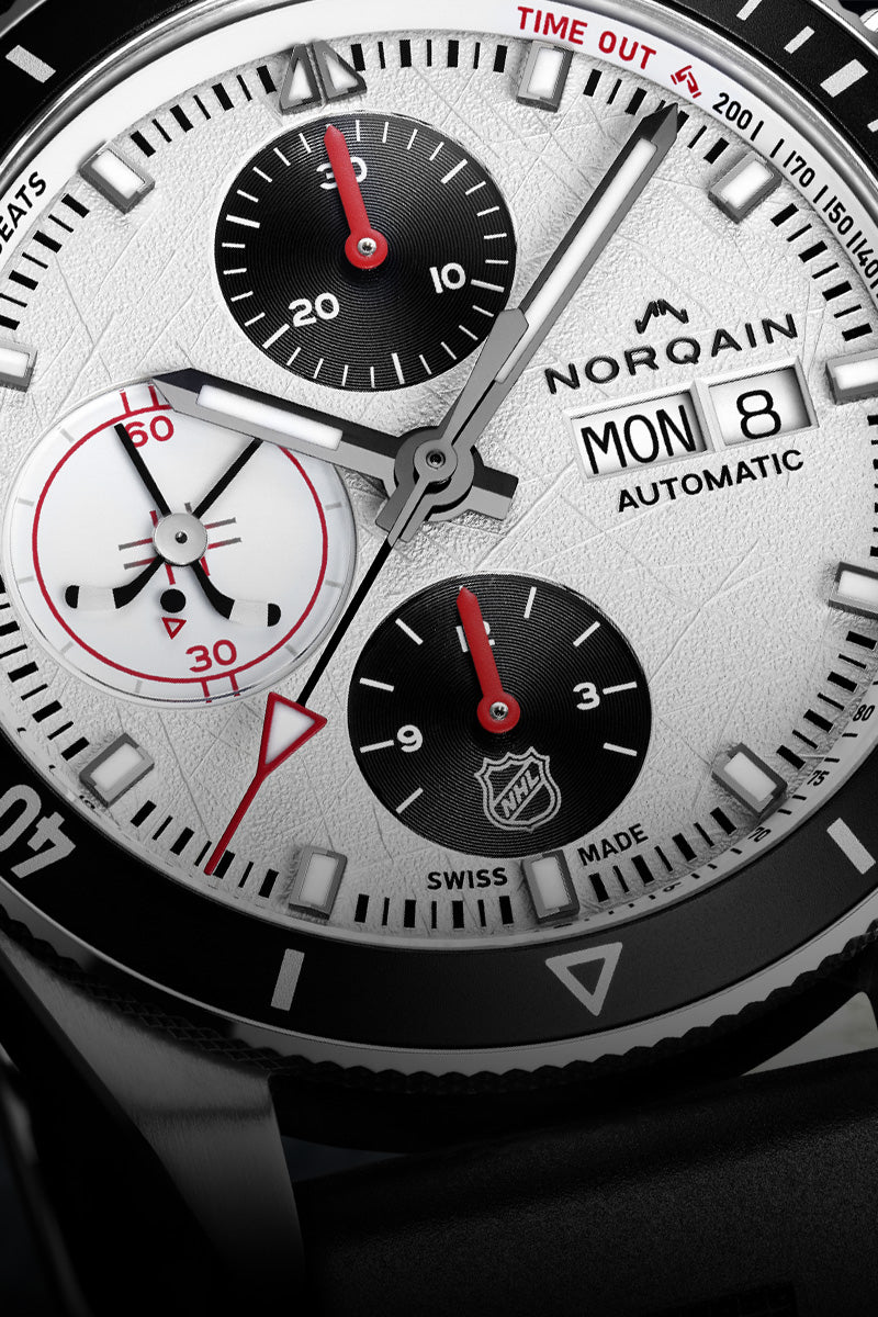 L’Adventure Chrono NHL Limited Edition incarna l’energia pura, la velocità e la precisione dell’hockey su ghiaccio. Creato per celebrare la partnership di NORQAIN con la National Hockey League, questo segnatempo in edizione limitata unisce l’adrenalina del gioco all’alta orologeria svizzera. I dettagli ispirati all’hockey, discreti ma dal carattere deciso, rendono omaggio all’intensità e allo spirito di questo sport. Proprio come l’hockey, anche questo orologio vive di precisione assoluta, resilienza e tempismo al secondo: un’espressione potente di performance, sul ghiaccio e oltre.
